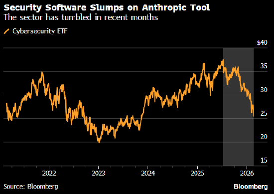 *** 安全股的下跌是AI竞争担忧引发的软件股抛售的又一例证。这种焦虑情绪已持续数周,iShares 扩展科技-软件部门ETF今年以来已下跌超过 23%,势将创下2008年金融危机以来更大的季度跌幅。