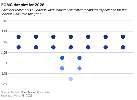 央行所谓的“点阵图”显示了19位匿名委员的预期,其中对2026年底联邦基金利率的预估中值为3.4%,与去年年底的预测相同。