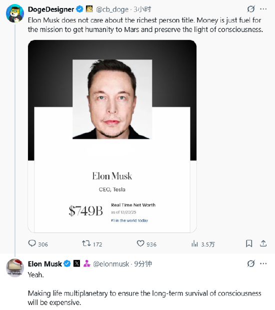 2025年12月21日 17:45有博主发文称“埃隆・马斯克并不在乎世界首富的头衔。财富不过是推动一项使命的燃料 —— 让人类登陆火星,延续文明火种”,并配图马斯克身家于上周五晚间飙升至7490亿美元。 马斯克回应称:“的确如此。要实现生命的多行星生存、保障文明