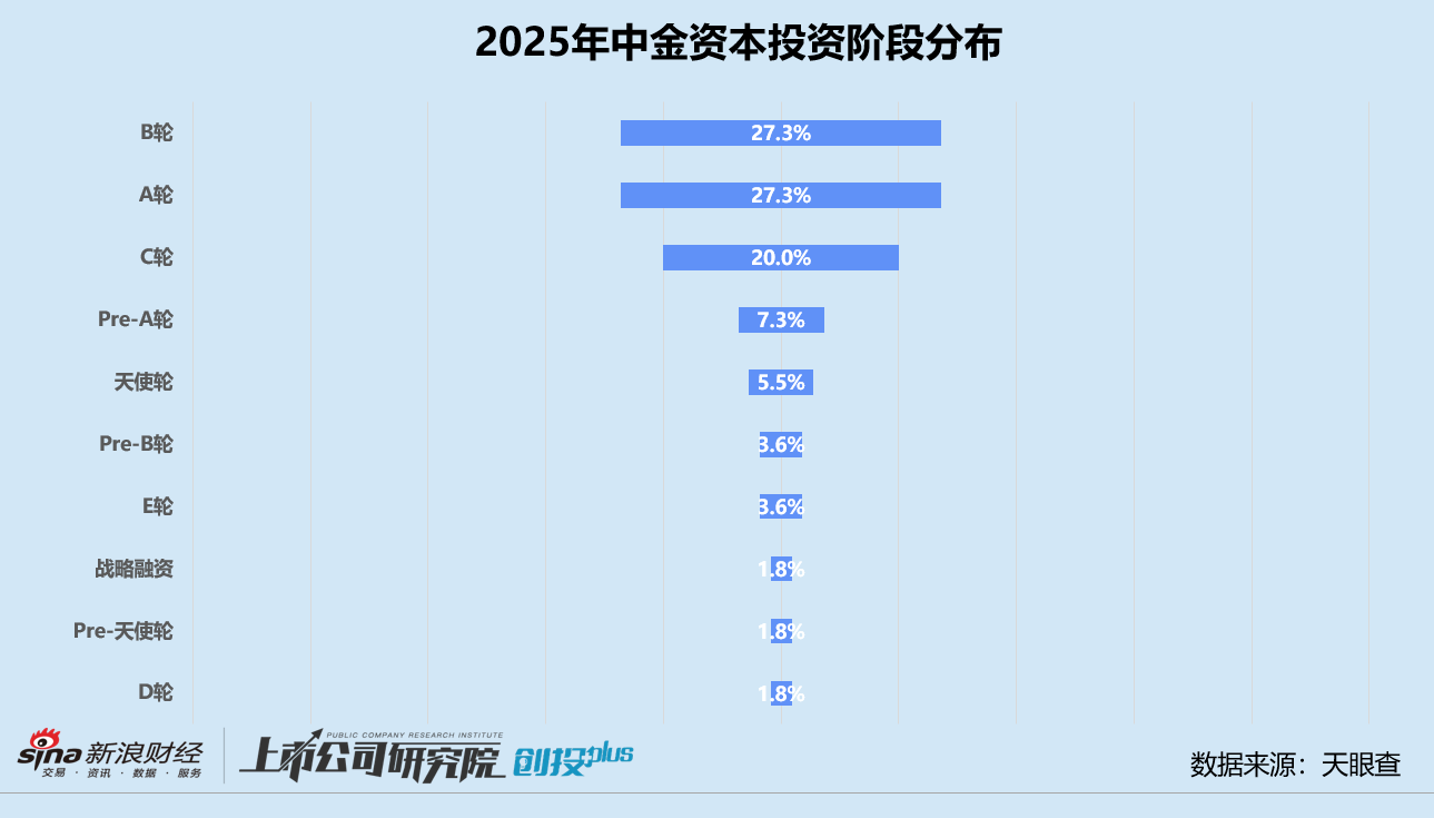 从投资阶段来看,中金资本参与的投资事件中成长期阶段是绝对主力,A轮和B轮投资事件数各占比27.3%,C轮约占20.0%,三类轮次合计占比接近四分之三。相较之下,Pre-天使轮、天使轮和Pre-A轮合计占比14.5%,同比减少3.2个百分点。